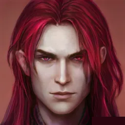 This man has narrow eyes that are the color of amethysts. he has shoulder-length, wavy, scarlet hair bound in one large ponytail. His physical form is rather sleek. An air of aloofness radiates from him. He has an elegant nose and thin eyebrows.