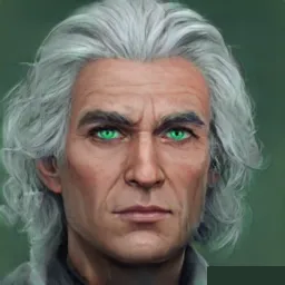 This brave knight's wide eyes are the color of wild grass. And his very short, curly, thick, white hair is worn in an utilitarian style. He has an angular build. His military style costume is brown and yellow in even proportions and it includes talon-like gloves.