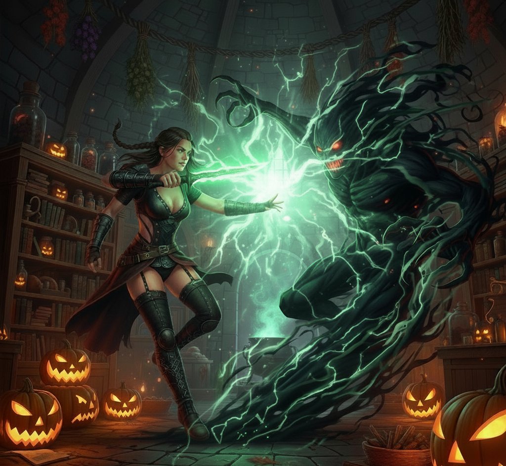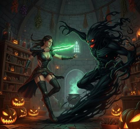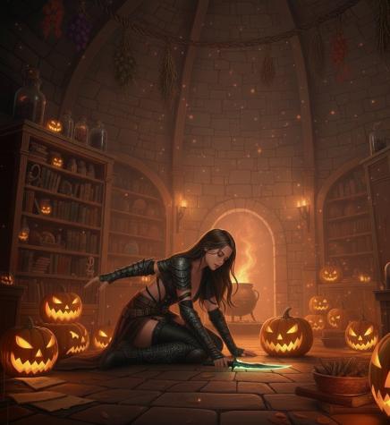 With a final wail, the creature vanished, leaving only the smell of ozone and a profound silence. Exhausted, the woman collapsed onto the floor, the glowing knife falling from her hand. It came to rest next to a grinning pumpkin, its eerie glow now seeming a little less sinister. She look around the warm glowing den that her mom has left for her. She is safe for now.