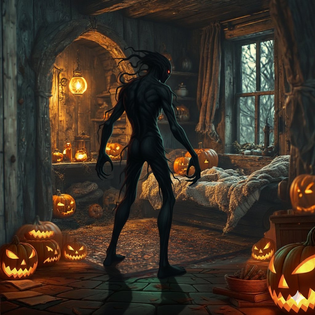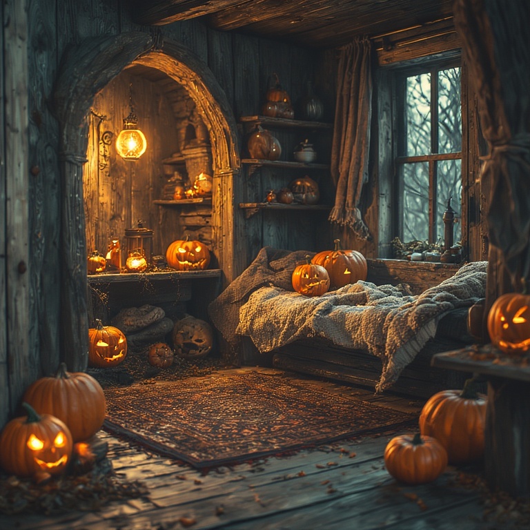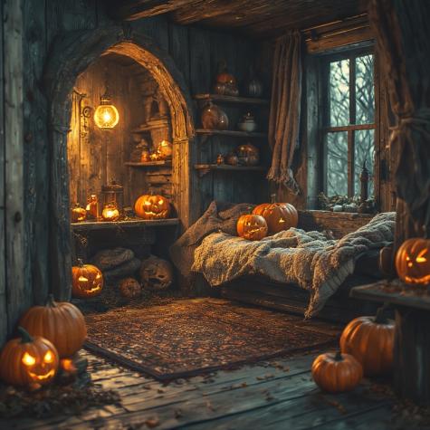 The den smelled of damp earth and woodsmoke, the air thick with the scent of sweet decay. Candlelight flickered, making the carved pumpkins dance with wicked grins. In a shadowy corner, a small bed lay, its rumpled blanket untouched. On a shelf above it, strange glass bottles and trinkets glinted in the dim light.